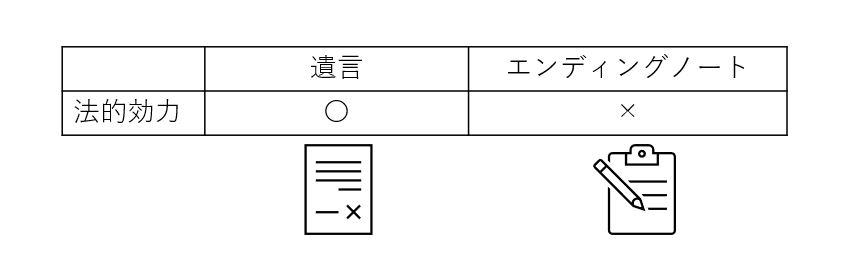 ただ、両者の最も大きな違いとして、法的効力の有無が挙げられます。すなわち、遺言には法的効力があり、遺言書に書いた意思表示の内容は、自身の死後も法的効力があるものとして実行してもらうことができます。これに対し、エンディングノートは、あくまでも自身の希望などを伝えるにとどまり、その内容どおりに実行してもらえるとは限らない、ということになります。