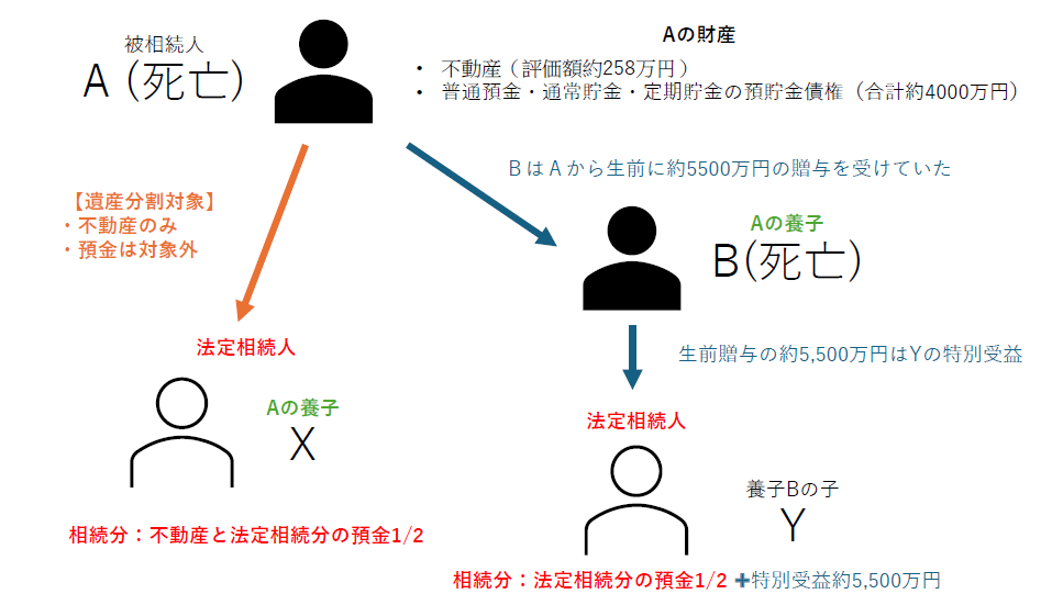 被相続人Aの法定相続人は、Aの養子のXとAの養子Bの子のYの2名で、法定相続分は各2分の1であり、Aは死亡時、不動産(評価額約258万円)と普通預金・通常貯金・定期貯金の預貯金債権(合計約4000万円)を有していました。BはAから生前に約5500万円の贈与を受けており、これがYの特別受益に当たるとされていました。また、XY間で預貯金債権を遺産分割の対象とする旨の合意はありませんでした。